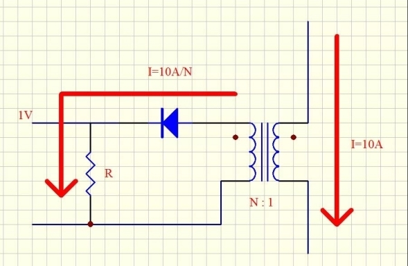 假定用電流互感器檢測變換器的原邊電流,原邊10A電流對應(yīng)1V電壓。當(dāng)然,咱們能夠用一個(gè)1V/10A=100mΩ的電阻來檢測,可是電阻將構(gòu)成的損耗為1V×10A=10W,這么大的損耗對幾乎一切的規(guī)劃來說都是不能承受的。所以,要選用電流互感器,如圖1所示。
